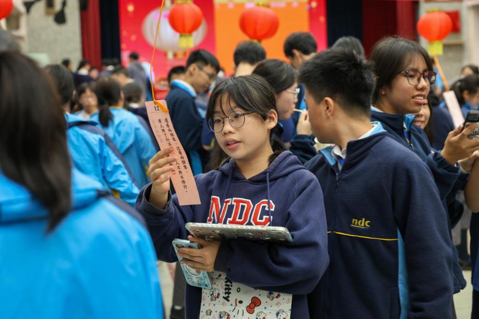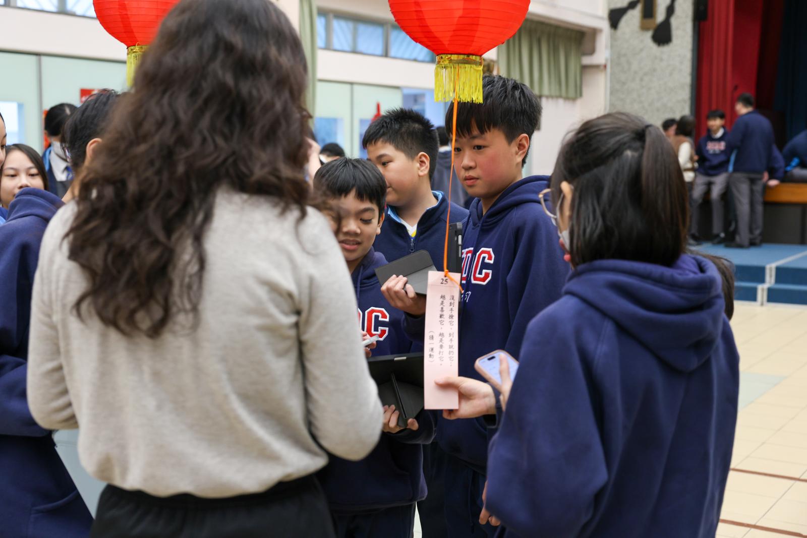 適逢元宵佳節,本校中文學會於3月3日舉辦了「新春元宵嘉年華」,讓同學深入了解及體驗傳統中華文化,在歡聲笑語中度過充實而有意義的午後 。同學穿梭於燈籠之間參與猜燈謎遊戲,時而低頭沉思,時而驚喜高呼,氣氛熱烈。師生亦聚首一堂,品嚐湯圓,共享節日喜悅 。